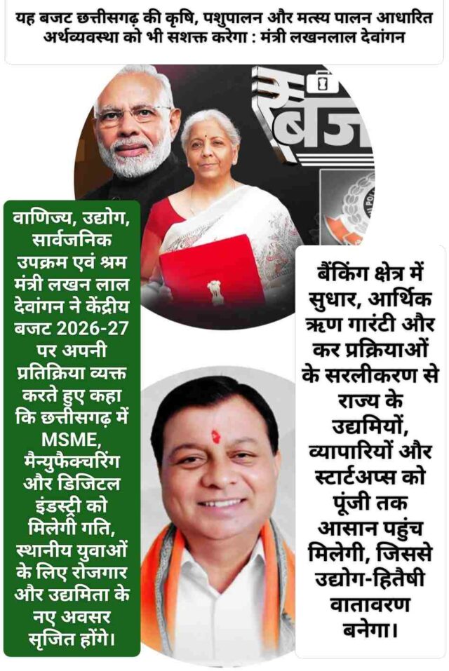 वाणिज्य, उद्योग, सार्वजनिक उपक्रम एवं श्रम मंत्री लखन लाल देवांगन ने केंद्रीय बजट 2026-27 पर अपनी प्रतिक्रिया व्यक्त करते हुए कहा कि छत्तीसगढ़ में MSME, मैन्युफैक्चरिंग और डिजिटल इंडस्ट्री को मिलेगी गति, स्थानीय युवाओं के लिए रोजगार और उद्यमिता के नए अवसर होंगे सृजित।