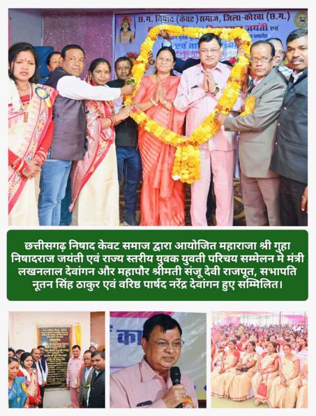 छत्तीसगढ़ निषाद केवट समाज द्वारा आयोजित महाराजा श्री गुहा निषादराज जयंती एवं राज्य स्तरीय युवक युवती परिचय सम्मेलन मे मंत्री लखनलाल देवांगन और महापौर श्रींमती संजू देवी राजपूत हुए सम्मिलित।