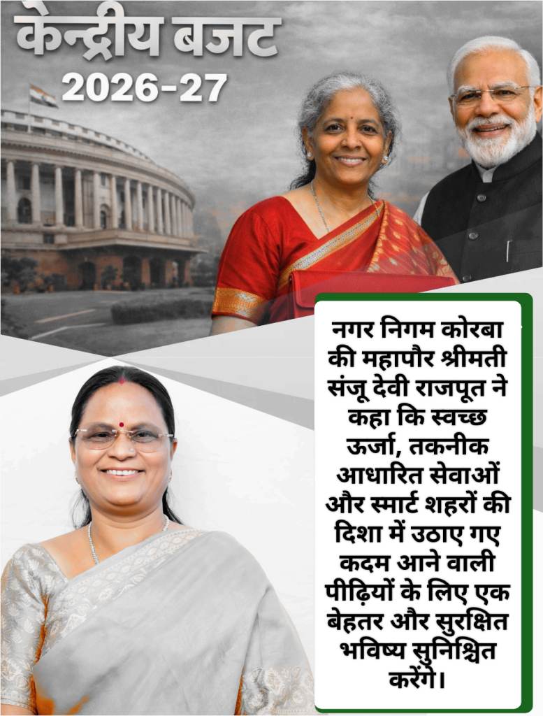 कोरबा। नगर पालिक निगम की महापौर श्रीमती संजू देवी राजपूत ने केंद्र सरकार द्वारा प्रस्तुत आम बजट की सराहना करते हुए इसे विकास और सामाजिक संतुलन का बजट बताया है। उन्होंने कहा कि यह बजट समाज के हर वर्ग को ध्यान में रखकर तैयार किया गया है, जिसमें गरीब, किसान, मध्यम वर्ग, महिलाएं और युवा केंद्र में हैं। यह बजट समावेशी सोच को दर्शाता है और जनहित को प्राथमिकता देता है।