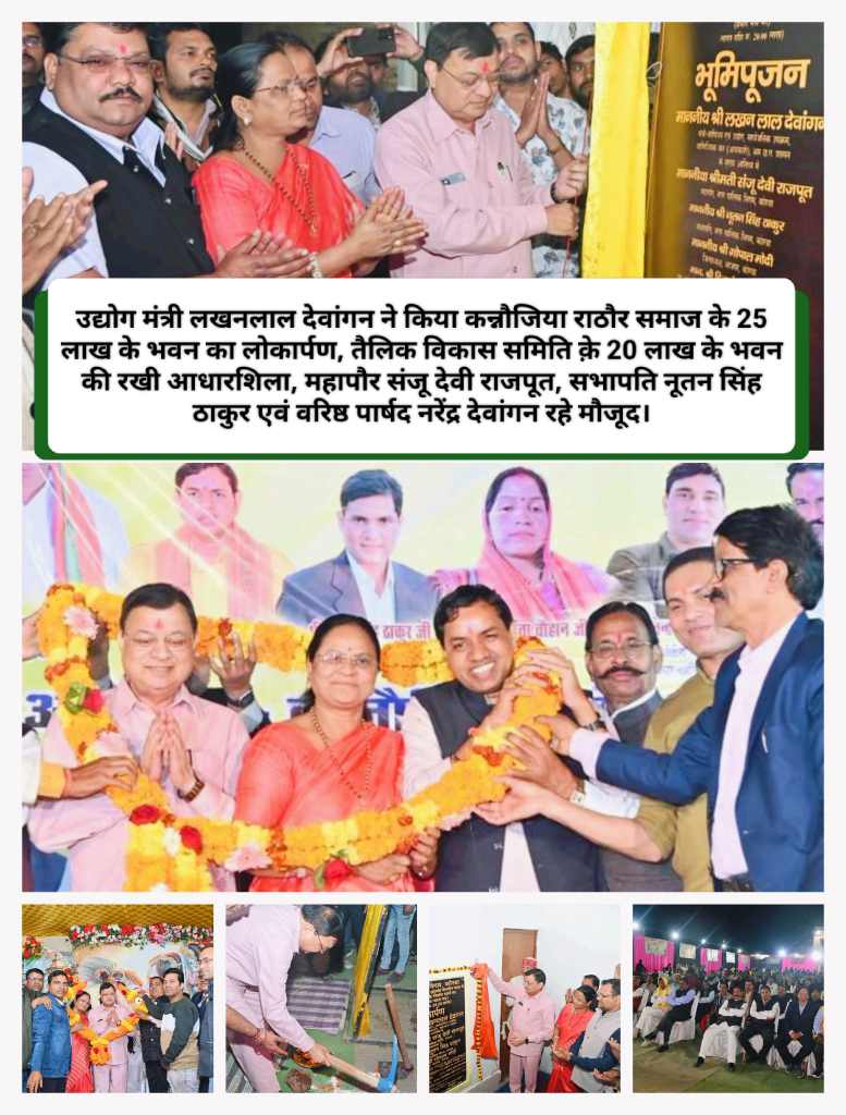 उद्योग मंत्री लखनलाल देवांगन ने कन्नौजिया राठौर समाज के 25 लाख क़े भवन का लोकार्पण और तैलिक विकास समिति क़े 20 लाख क़े भवन की रखी आधारशिला, महापौर संजू देवी राजपूत, सभापति नूतन सिंह ठाकुर एवं वरिष्ठ पार्षद नरेंद्र देवांगन रहे मौजूद।