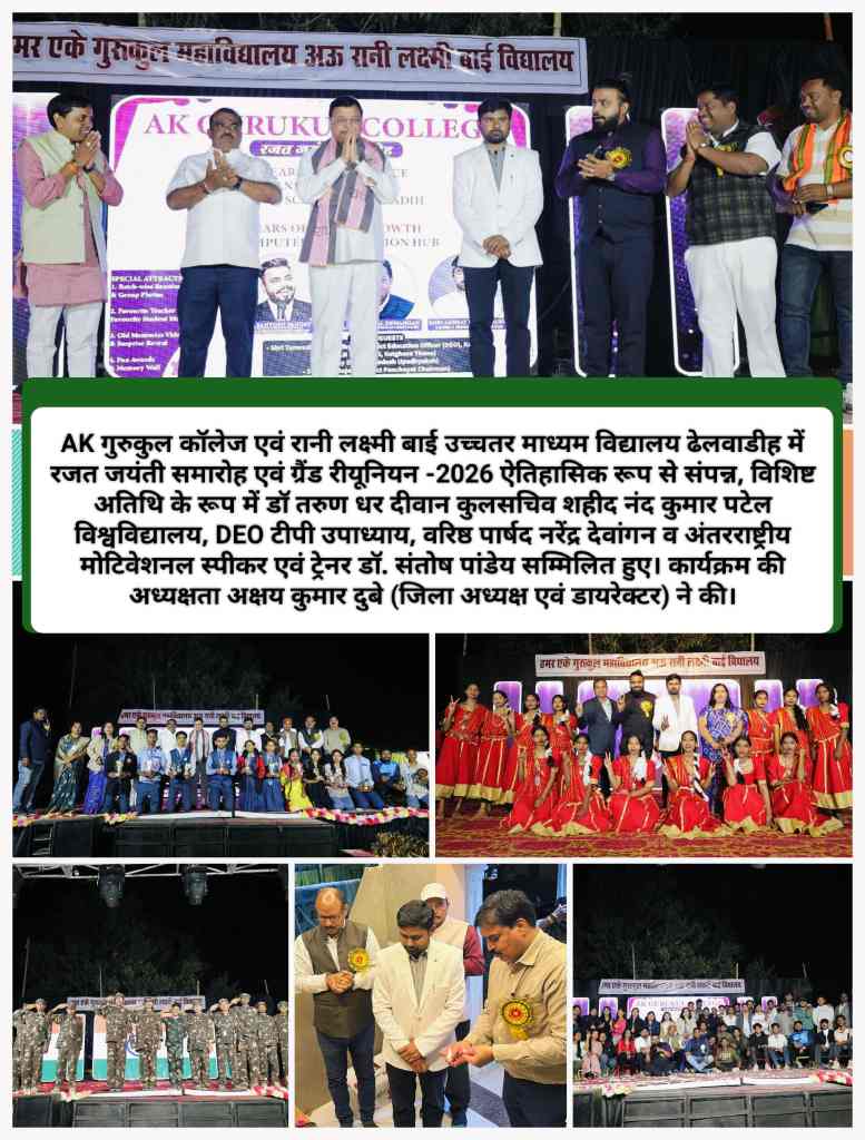 AK गुरुकुल कॉलेज एवं रानी लक्ष्मी बाई उच्चतर माध्यम विद्यालय ढेलवाडीह में रजत जयंती समारोह एवं ग्रैंड रीयूनियन -2026 ऐतिहासिक रूप से संपन्न, विशिष्ट अतिथि के रूप में डॉ तरुण धर दीवान कुलसचिव शहीद नंद कुमार पटेल विश्वविद्यालय, DEO टीपी उपाध्याय, वरिष्ठ पार्षद नरेंद्र देवांगन व अंतरराष्ट्रीय मोटिवेशनल स्पीकर एवं ट्रेनर डॉ. संतोष पांडेय सम्मिलित हुए। कार्यक्रम की अध्यक्षता अक्षय कुमार दुबे (जिला अध्यक्ष एवं डायरेक्टर) ने की।