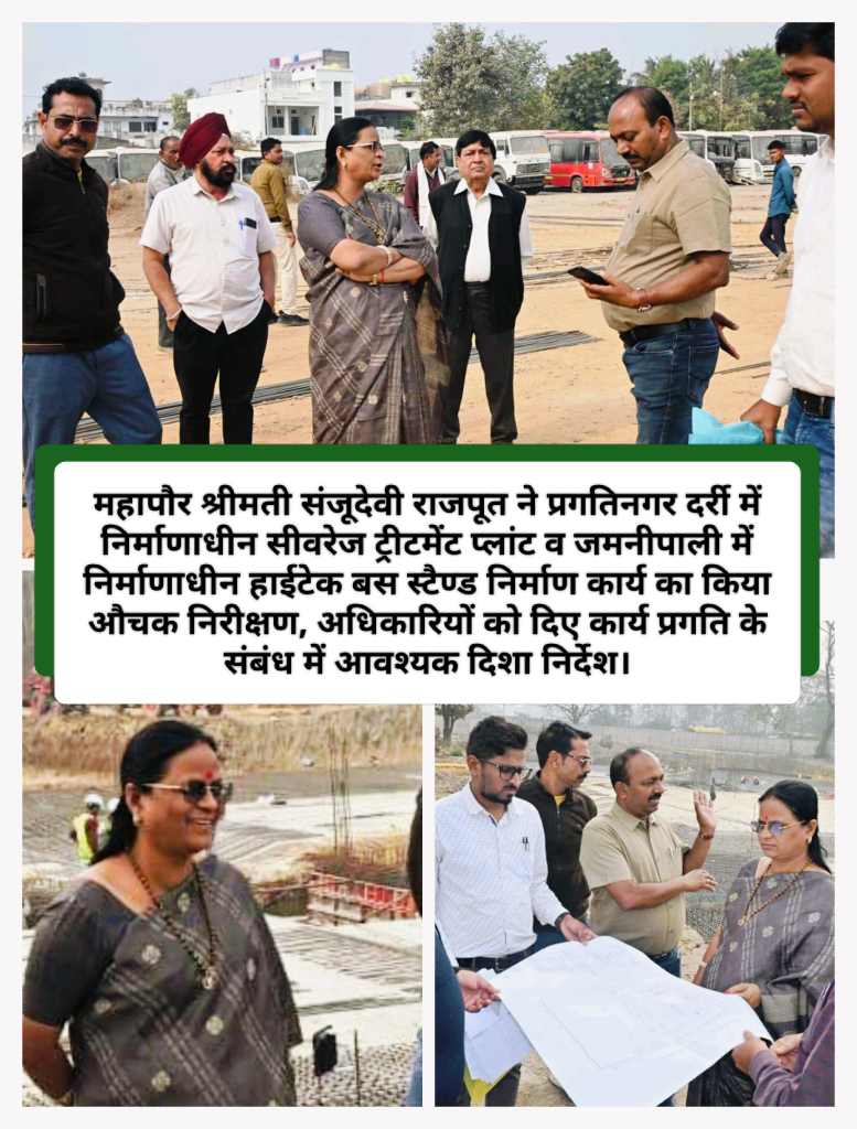 महापौर श्रीमती संजूदेवी राजपूत ने प्रगतिनगर दर्री में निर्माणाधीन सीवरेज ट्रीटमेंट प्लांट व जमनीपाली में निर्माणाधीन हाईटेक बस स्टैण्ड निर्माण कार्य का किया औचक निरीक्षण, अधिकारियों को दिए कार्य प्रगति के संबंध में आवश्यक दिशा निर्देश।