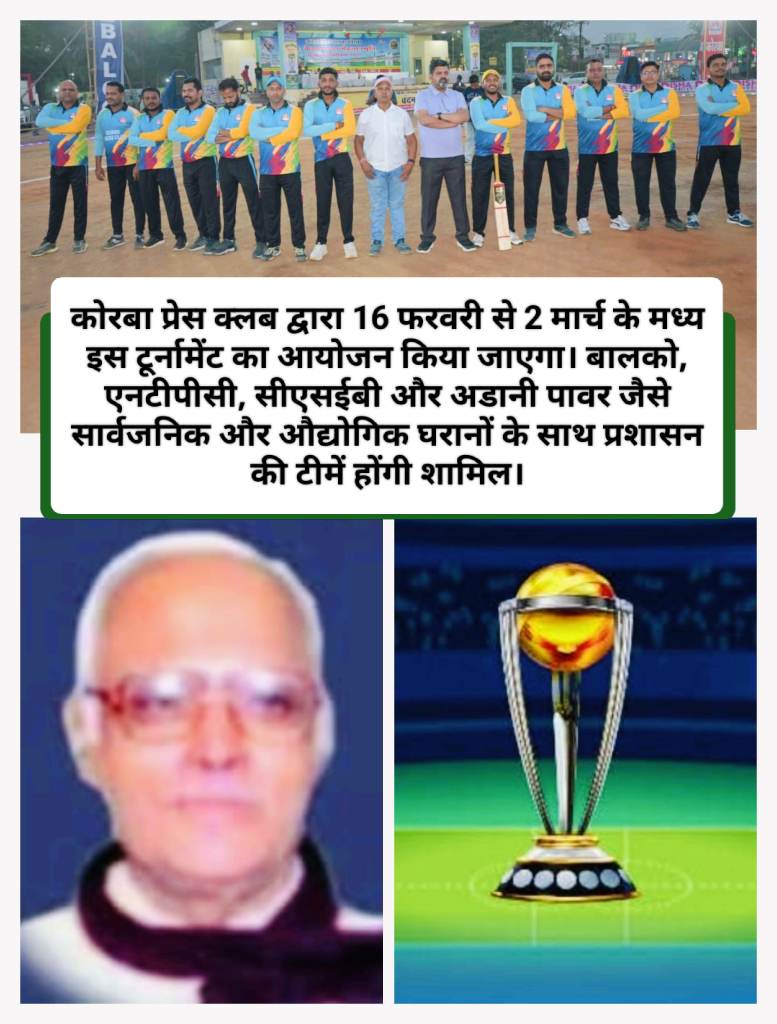 कोरबा प्रेस क्लब द्वारा 16 फरवरी से 2 मार्च के मध्य इस टूर्नामेंट का आयोजन किया जाएगा। बालको, एनटीपीसी, सीएसईबी और अडानी पावर जैसे सार्वजनिक और औद्योगिक घरानों के साथ प्रशासन की टीमें होंगी शामिल।