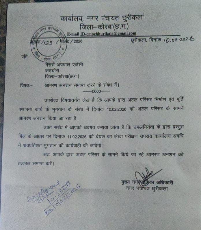 नगर पंचायत छुरी कला के मुख्य नगर पालिका अधिकारी ने लिखा है कि उपअभियंता के द्वारा प्रस्तुत बिल के आधार पर दिनांक 11.02.2026 को देयक का लेखा परीक्षण उपरांत कार्यालय अवधि में शतप्रतिशत भुगतान की कार्यवाही की जावेगी। अतः आपके द्वारा अटल परिसर के सामने किये जा रहे आमरण अनशन को तत्काल समाप्त करें।