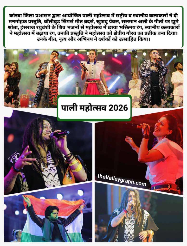 कोरबा(15 फरवरी 2026)। पाली महोत्सव 2026 का भव्य शुभारंभ उत्साह और उमंग के साथ हुआ, जहाँ श्रोताओं ने ऐतिहासिक पाली शिव मंदिर की पावन छाया में सांस्कृतिक और आध्यात्मिक आनंद का अनुभव किया। मंच पर बॉलीवुड के लोकप्रिय गायक सलमान अली, खुशबू ग्रेवाल, और मीत ब्रदर्स ने फिल्मी गीतों से दर्शकों का मन मोह लिया।
