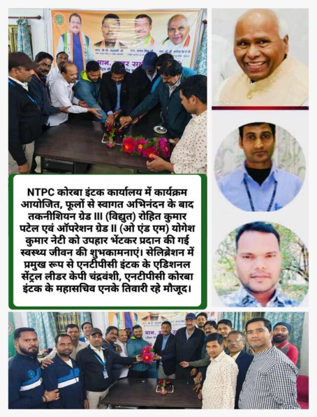NTPC कोरबा इंटक कार्यालय में कार्यक्रम आयोजित, फूलों से स्वागत अभिनंदन के बाद तकनीशियन ग्रेड III (विद्युत) रोहित कुमार पटेल एवं ऑपरेशन ग्रेड II (ओ एंड एम) योगेश कुमार नेटी को उपहार भेंटकर प्रदान की गई स्वस्थ्य जीवन की शुभकामनाएं।