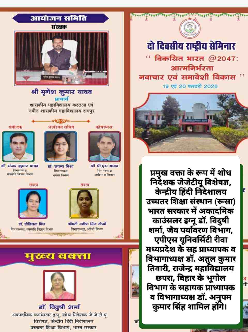 19 और 20 फरवरी को होने वाली इस संगोष्ठी का विषय विकसित भारत @2047: आत्मनिर्भरता नवाचार एवं समावेशी विकास है। संगोष्ठी का शुभारंभ सुबह 11 बजे मुख्य अतिथि डीएफओ कोरबा प्रेमलता यादव (IFS) करेंगी। प्रमुख वक्ता के रूप में शोध निदेशक जेजेटीयू विशेषज्ञ, केन्द्रीय हिंदी निदेशालय उच्चतर शिक्षा संस्थान (रूसा) भारत सरकार में अकादमिक काउंसलर इग्नू डॉ. विदुषी शर्मा, जैव पर्यावरण विभाग, एपीएस यूनिवर्सिटी रीवा मध्यप्रदेश के सह प्राध्यापक व विभागाध्यक्ष डॉ. अतुल कुमार तिवारी, राजेन्द्र महाविद्यालय छपरा, बिहार के भूगोल विभाग के सहायक प्राध्यापक व विभागाध्यक्ष डॉ. अनुपम कुमार सिंह शामिल होंगे। आयोजन समिति के संरक्षक गवर्नमेंट कॉलेज करतला, रामपुर के प्राचार्य मृगेश कुमार यादव, संयोजक राजनीतिक विज्ञान विभाग के विभागाध्यक्ष डॉ. संजय कुमार यादव, आयोजन सचिव भूगोल विभाग की एचओडी डॉ. सपना मिश्रा, कोषाध्यक्ष अर्थशास्त्र विभाग के विभागाध्यक्ष पीएस यादव, सदस्य वनस्पति विज्ञान की विभागाध्यक्ष डॉ. प्रीतिलता मिंज व अंग्रेजी विभाग की विभागाध्यक्ष मनीषा मिंज टोप्पो हैं। इस राष्ट्रीय संगोष्ठी का उद्देश्य विकसित भारत 2047 के विभिन्न आयामों यथा आत्मनिर्भरता, नवाचार एवं समावेशी विकास का बहुआयामी विश्लेषण करना है। यह गोष्ठी विद्वानों और शोधार्थियों को एक संयुक्त मंच प्रदान करेगी, जहां वे विकसित भारत की व्यवहार्यता, लाभ और सीमाओं पर रचनात्मक विमर्श कर सकेंगे। संगोष्ठी का प्रयास इस दिशा में एक समावेशी, सहभागी और बौद्धिक विमर्श को आगे बढ़ाना है। आयोजक मंडल ने अधिक से अधिक शोधार्थियों, छात्रों व प्राध्यापकों से शामिल होने का आह्वान किया है।