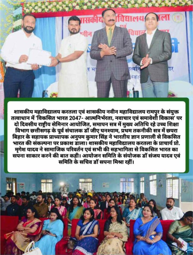 शासकीय महाविद्यालय करतला एवं शासकीय नवीन महाविद्यालय रामपुर के संयुक्त तत्वाधान में ‘विकसित भारत 2047- आत्मनिर्भरता, नवाचार एवं समावेशी विकास’ पर दो दिवसीय राष्ट्रीय संगोष्ठी आयोजित, समापन सत्र में मुख्य अतिथि रहे उच्च शिक्षा विभाग छत्तीसगढ़ के पूर्व संचालक डॉ जीए घनश्याम।