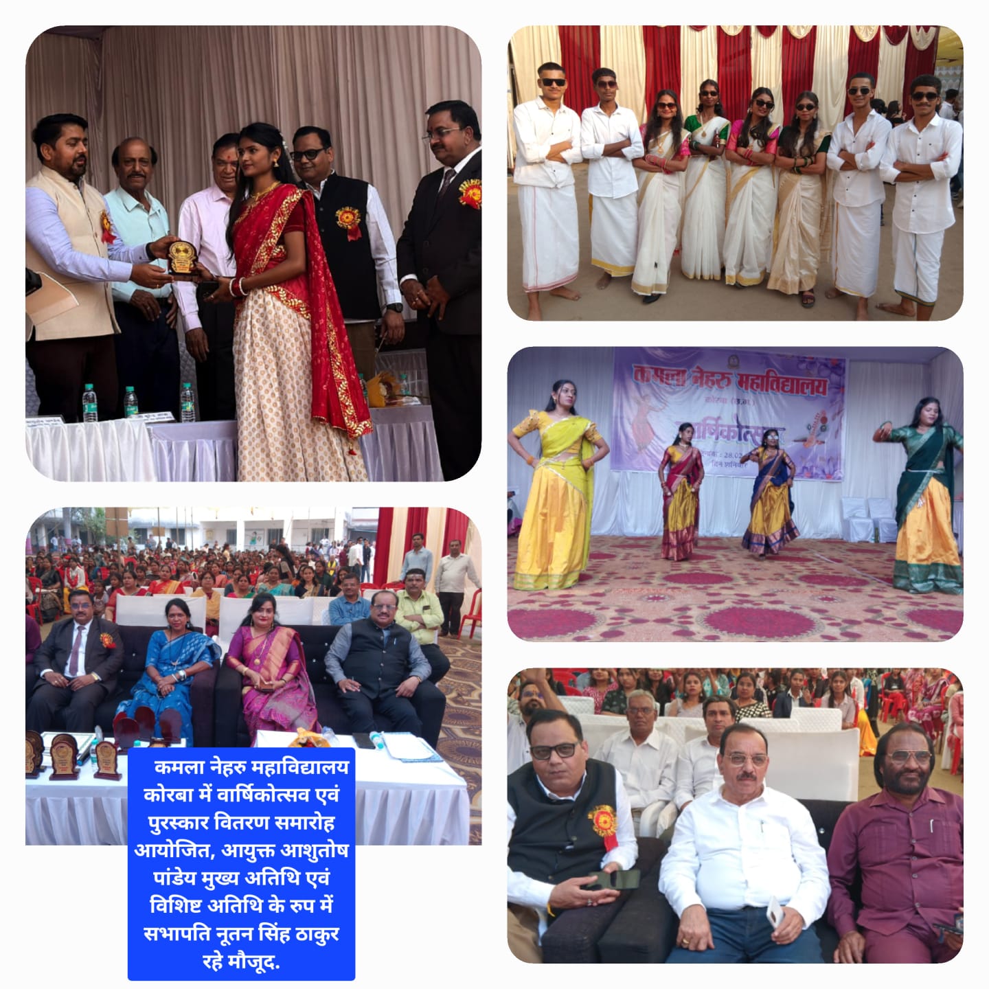 कमला नेहरु महाविद्यालय कोरबा में वार्षिकोत्सव एवं पुरस्कार वितरण समारोह आयोजित, आयुक्त आशुतोष पांडेय मुख्य अतिथि एवं विशिष्ट अतिथि के रुप में सभापति नूतन सिंह ठाकुर रहे मौजूद, आयुक्त आशुतोष पांडेय ने कहा कि- उच्च शिक्षा में छग देश की अग्रणी पंक्ति में है, इसमें केएन काॅलेज की भी बड़ी भूमिका है। विशिष्ट अतिथि रहे नगर निगम कोरबा के सभापति नूतन सिंह ठाकुर ने कहा कि- जब विद्यार्थी खड़ा हो जाता है, तब क्रांति आती है।